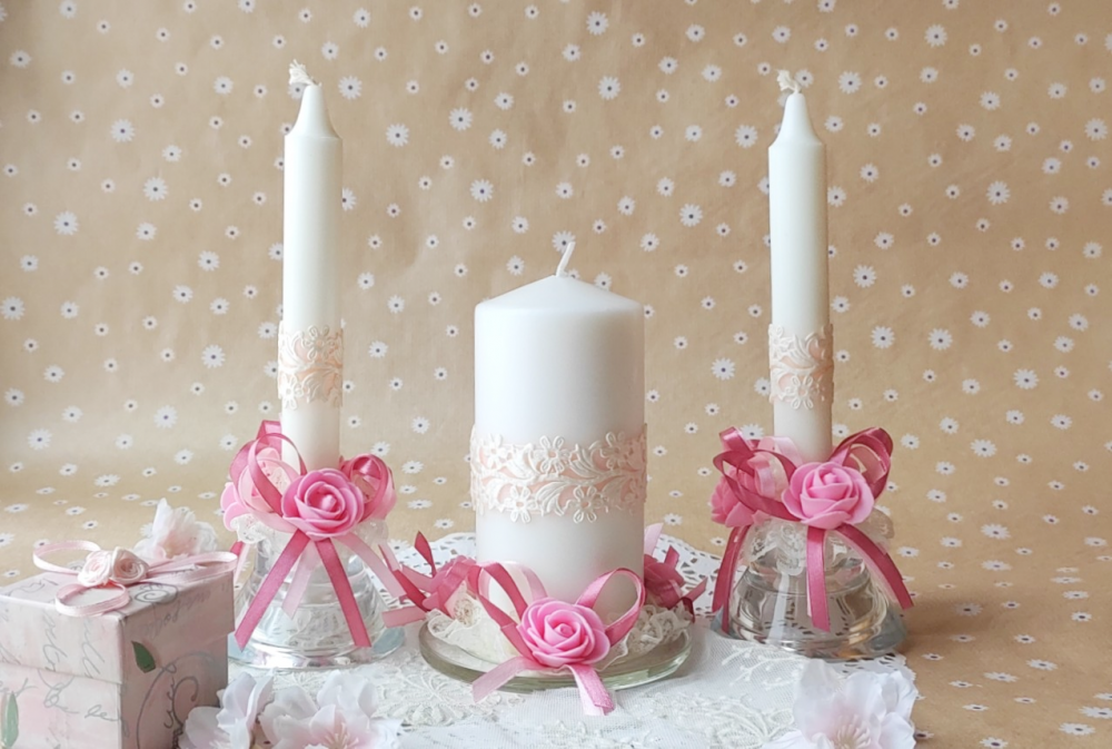 Свадебные свечи декорированы тонким кружевом, атласными бантиками и нежными розочками из латекса и атласа.